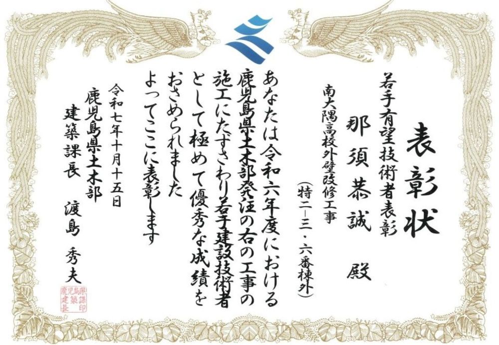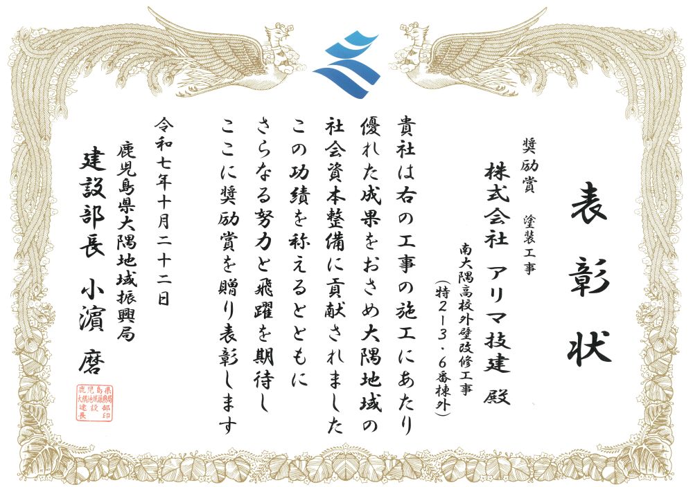 令和7年度鹿児島県建設部長等優良工事奨励賞(その他工事(塗装))表彰において、弊社施工の工事が