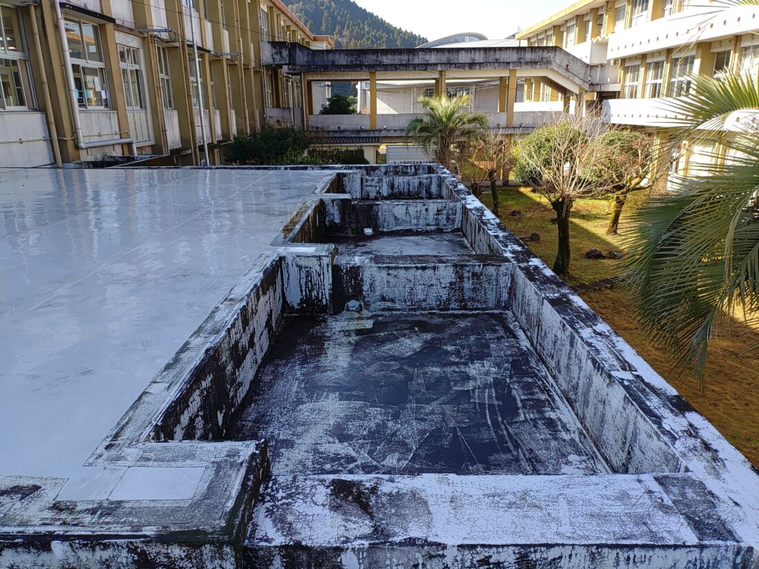 この度、姶良市教育委員会より蒲生中学校1号棟玄関屋根防水修繕工事のご依頼いただきました。